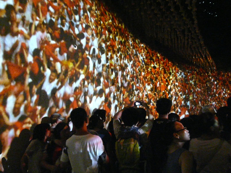 Το ανθρώπινο πλήθος εκμηδενίζει το τοπίο, απορροφά μνημεία, ιστορικές κατασκευές, εμπνευσμένες αρχιτεκτονικές. Είναι η ρευστή ύλη που διαλύει την ιδεατή πόλη μέσα στην πραγματική και το αντίστροφο.